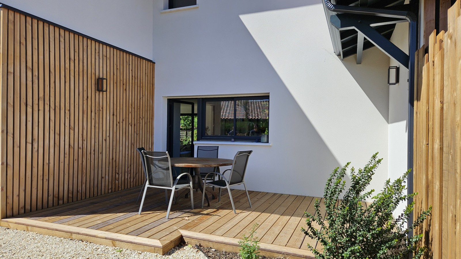 Ensuite un bel espace de vie en prolongement de la maison a été créé. Une terrasse en bois sur plots béton a été mis en place en sapin rouge du Nord classe 4. Cette essence choisit est issu d’une filière éco-certifié Européenne, son traitement autoclavé permet d’assurer une bonne pérennité.