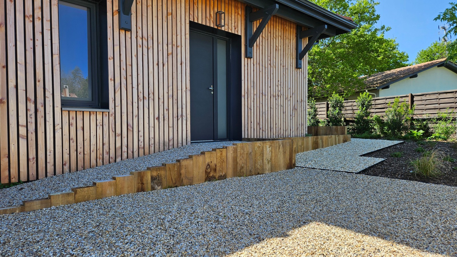 Pour rendre la circulation dans le jardin la plus fonctionnelle possible, deux escaliers en traverses de la même essence viennent compléter l’aménagement.